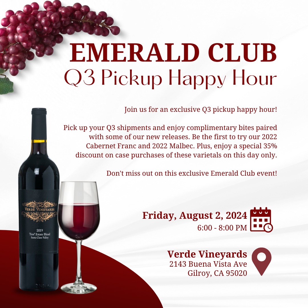 We’re inviting our Emerald Club members for an exclusive happy hour evening on Friday, August 2nd. Emerald Club members are invited to pick up their Q3 shipments and enjoy complimentary bites paired with some of our new releases. Be the first to try our 2022 Cabernet Franc and 2022 Malbec. Plus, enjoy a special 35% discount on case purchases of these varietals on this day only.